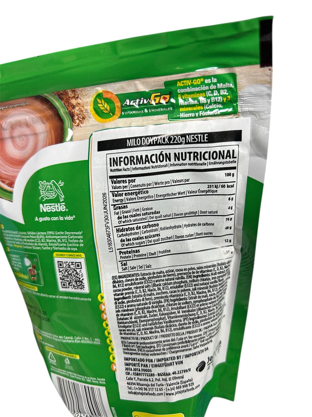 Disfruta el Milo en Polvo Doypack 220gr Nestlé, una bebida deliciosa con malta y cacao que aporta energía y sabor para toda la familia.